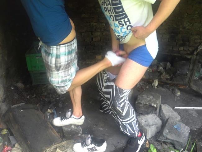 Amateur-Footjob für Twinks im Freien
